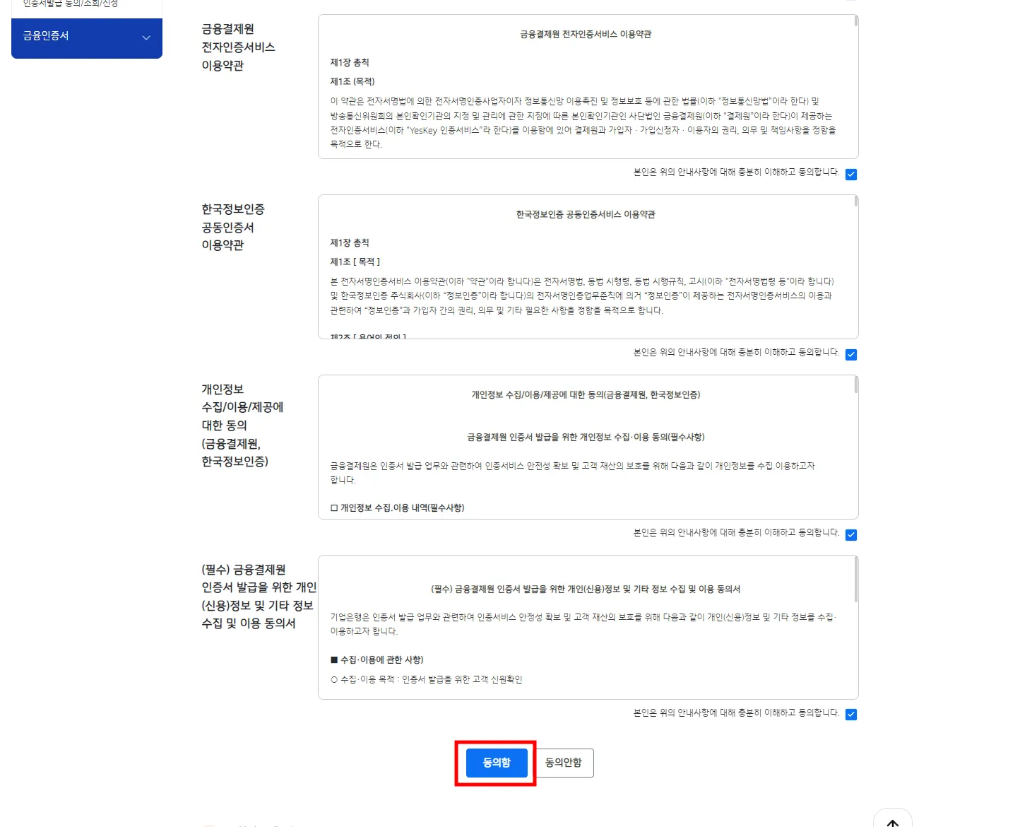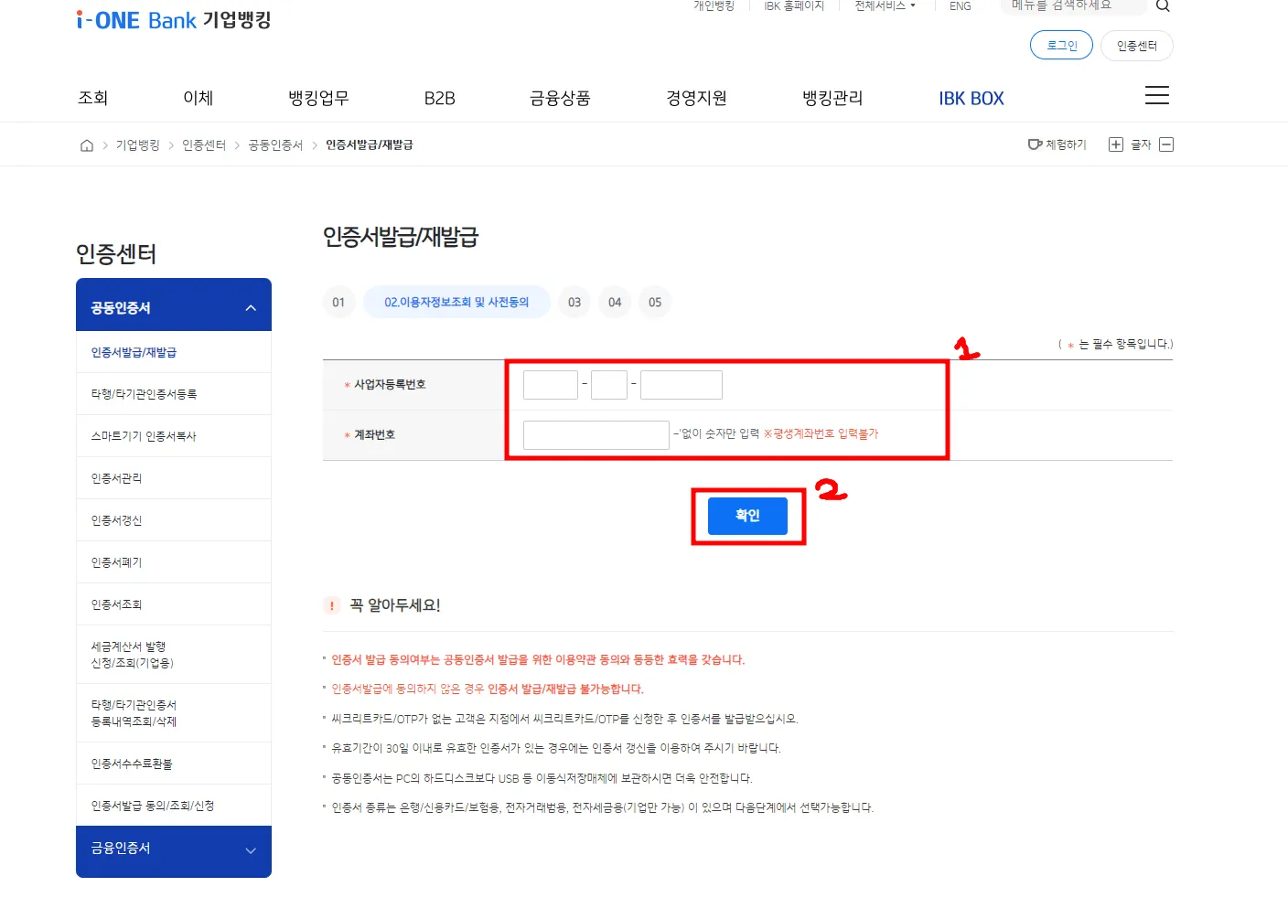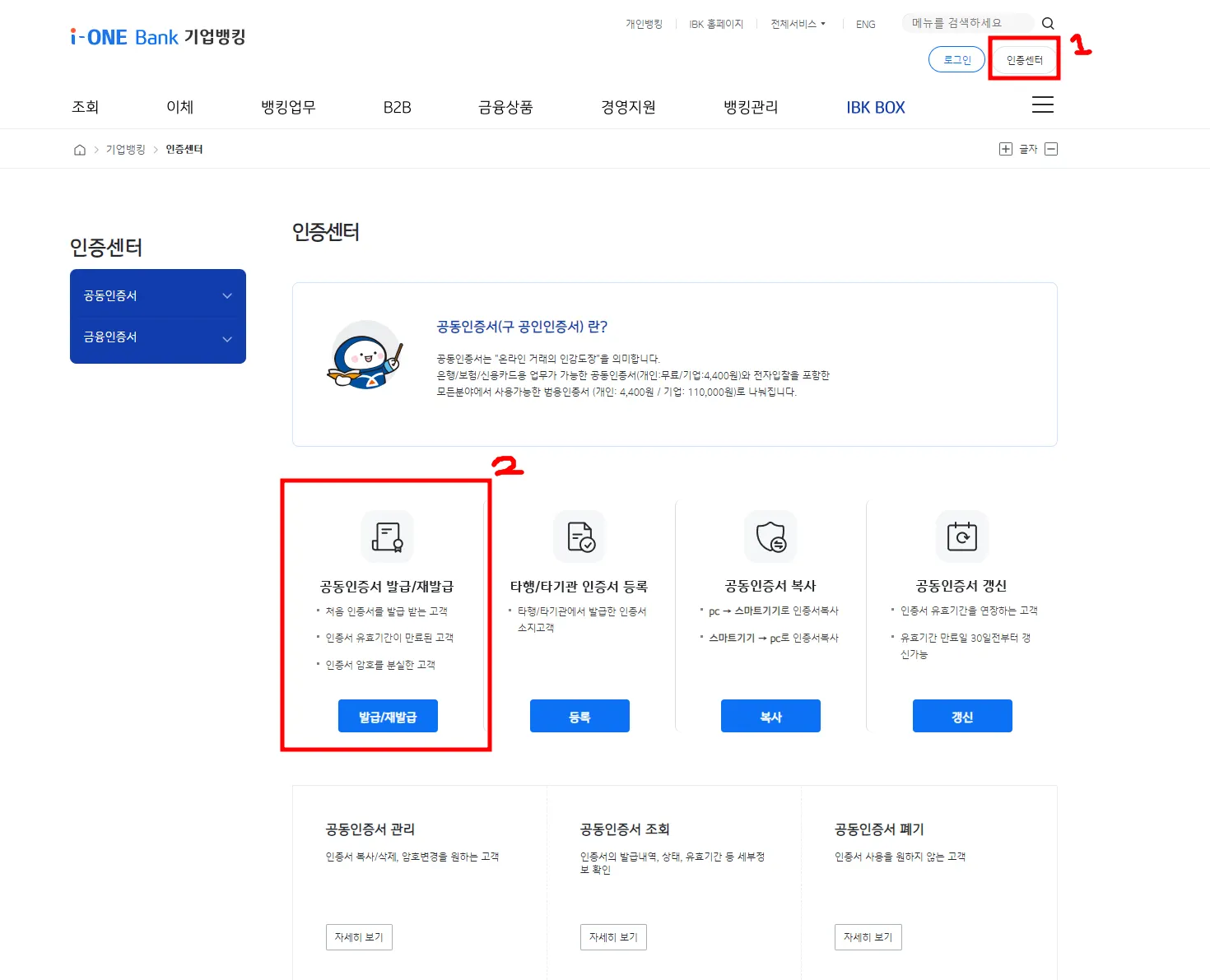 사업용계좌 개설한 은행 홈페이지 접속 → 인증센터 → 공동인증서 발급/재발급