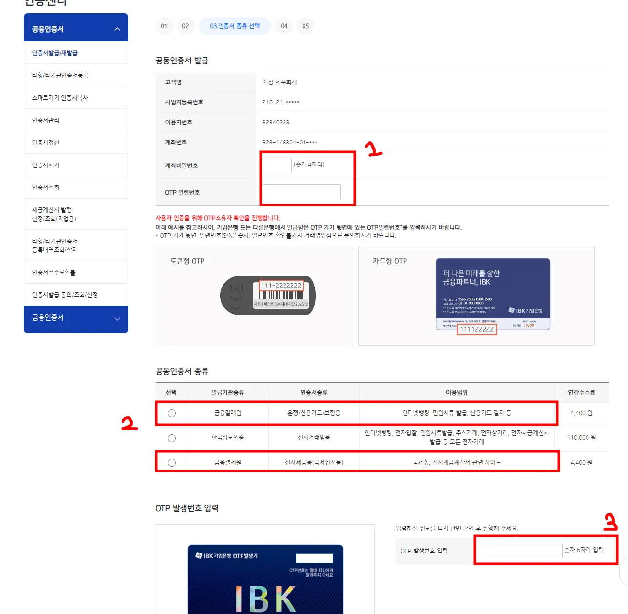 (전자세금계산서용) 계좌비밀번호 → OTP일련번호 → 인증서종류(전자세금융(국세청전용)) → OTP 발생번호