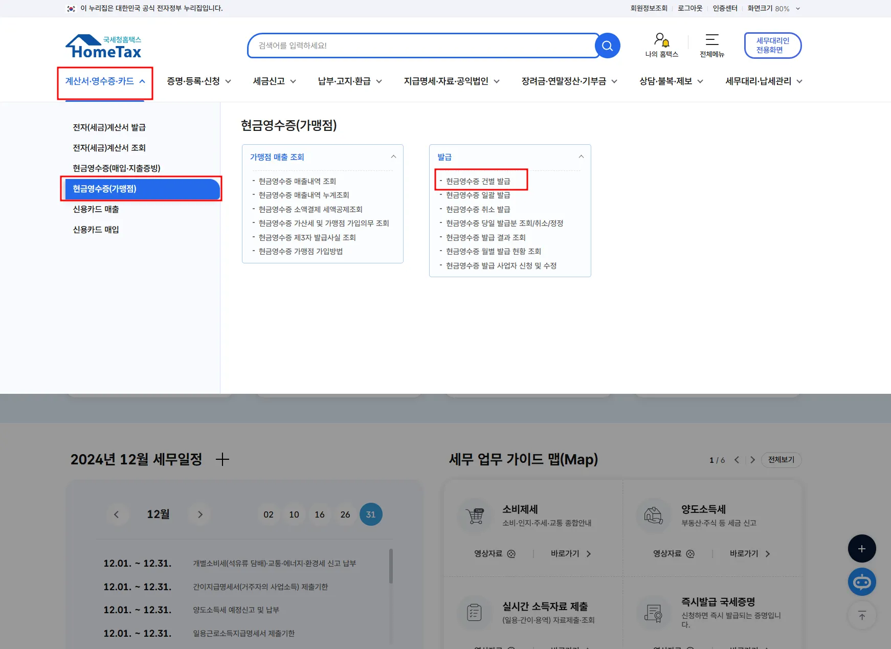 홈택스 로그인 → 계산서.영수증 → 현금영수증(가맹점) → 발급 → 현금영수증 건별 발급