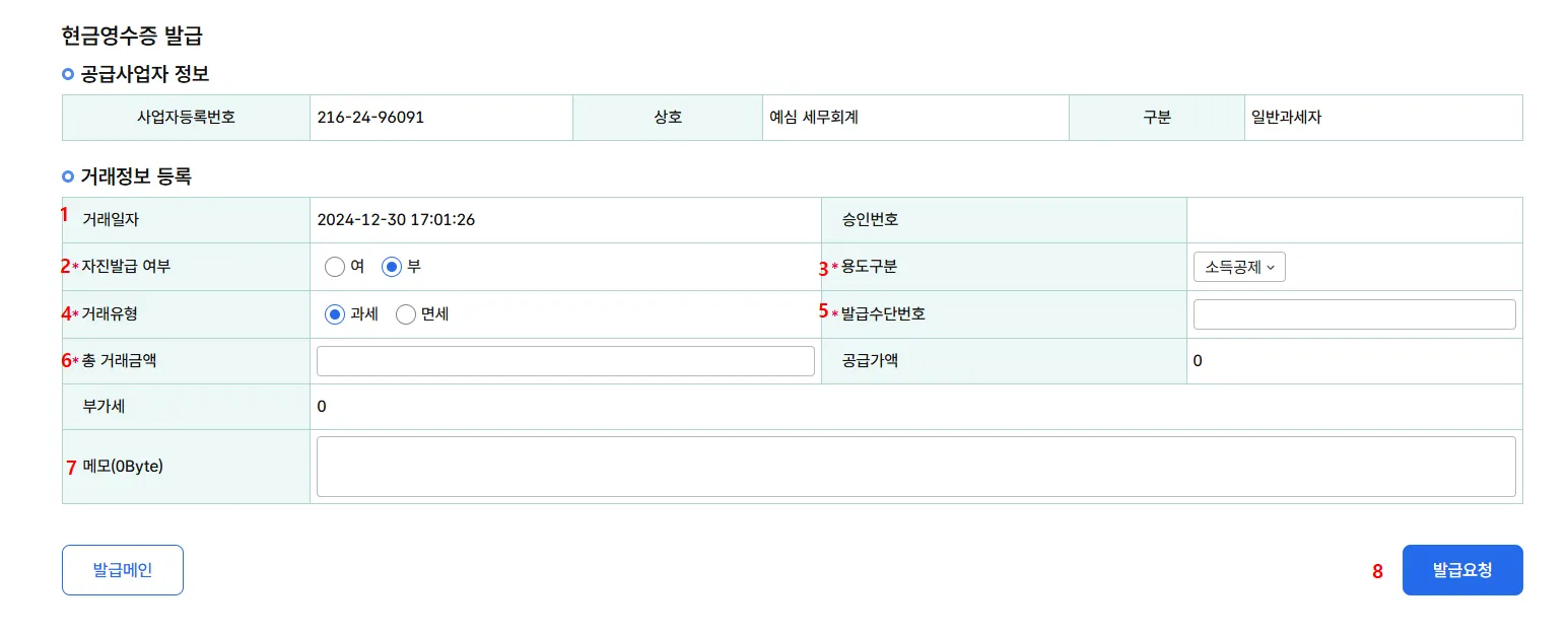 거래일자 : 현금영수증은 물리적인 현재 시간으로 적용됨으로 인해 수정 불가능.