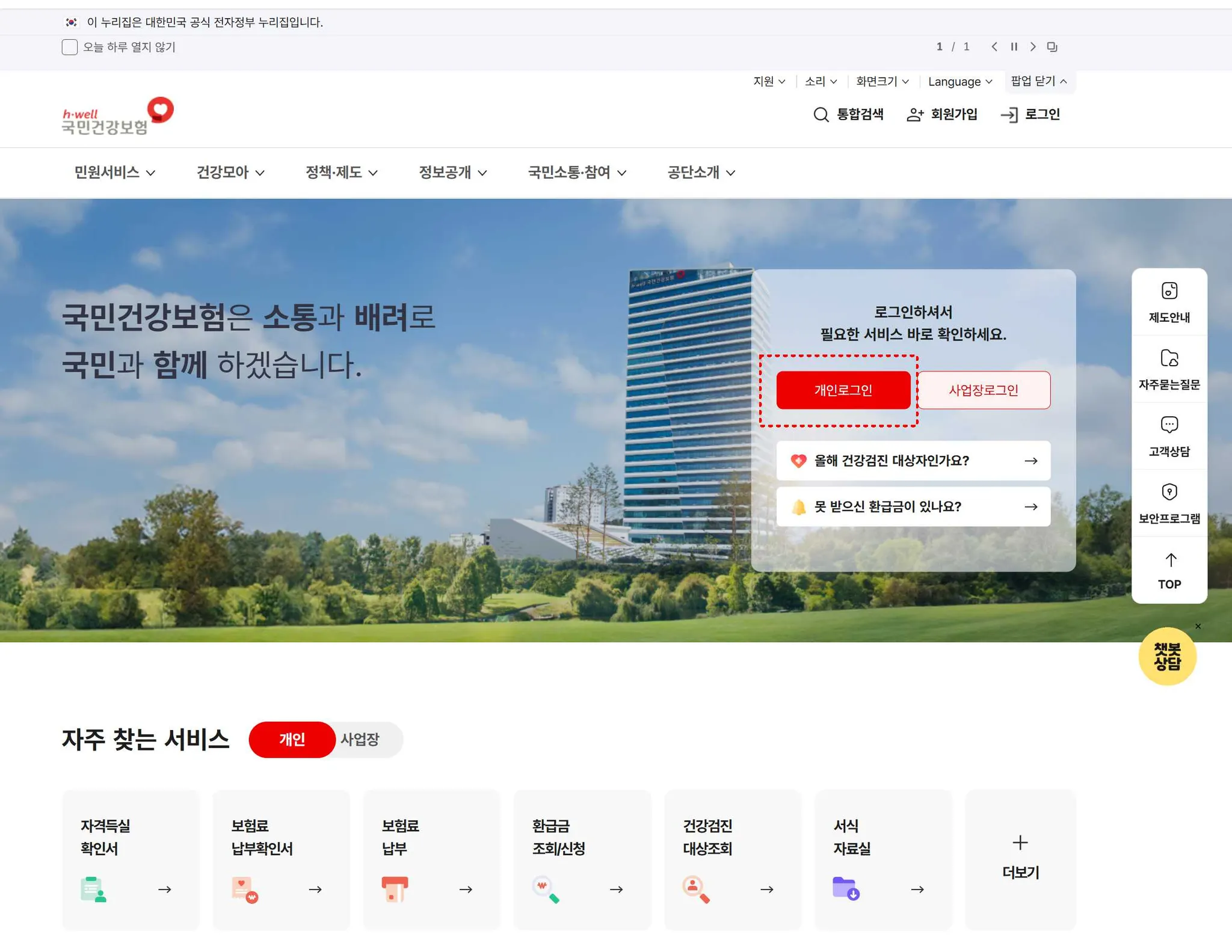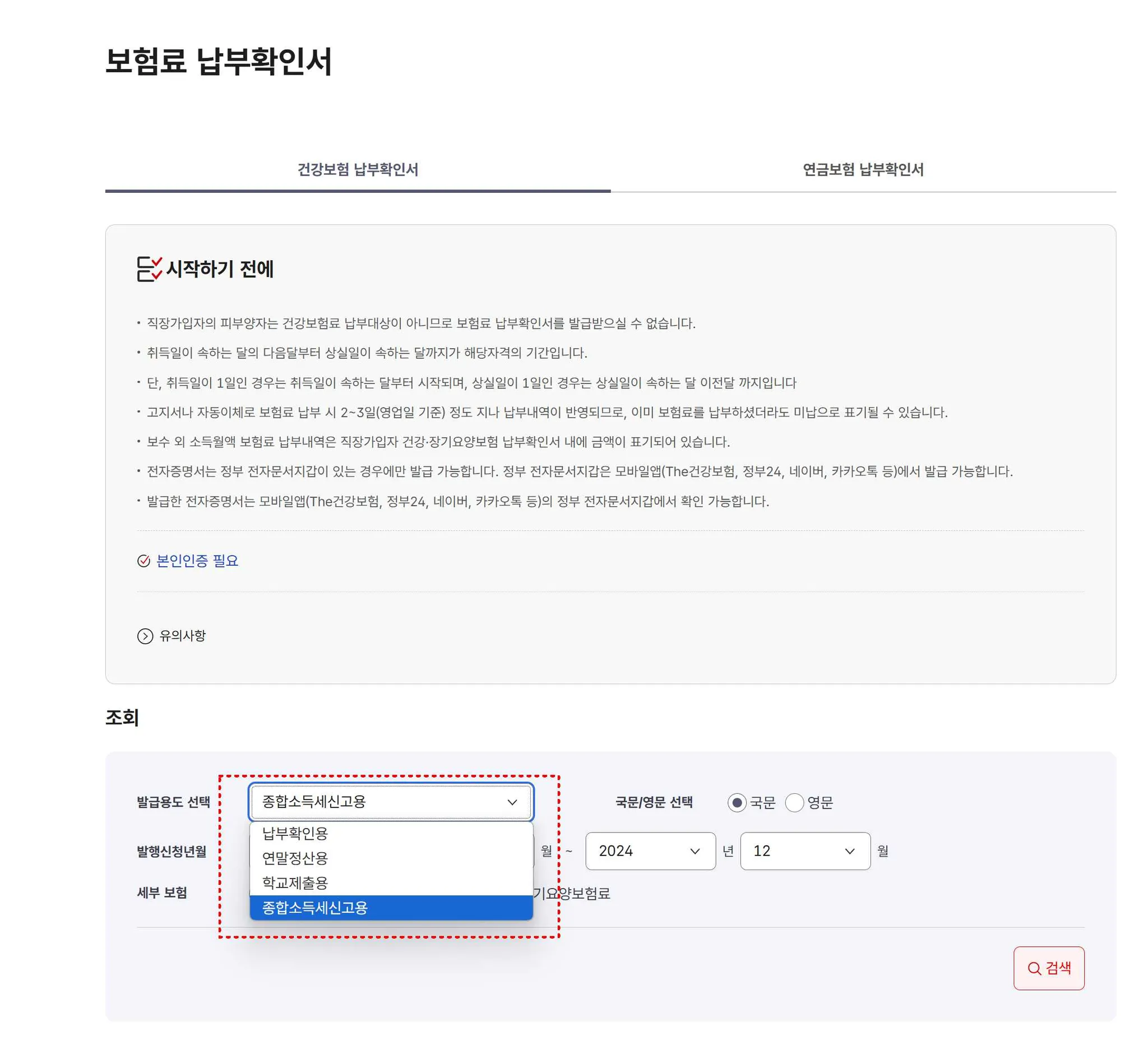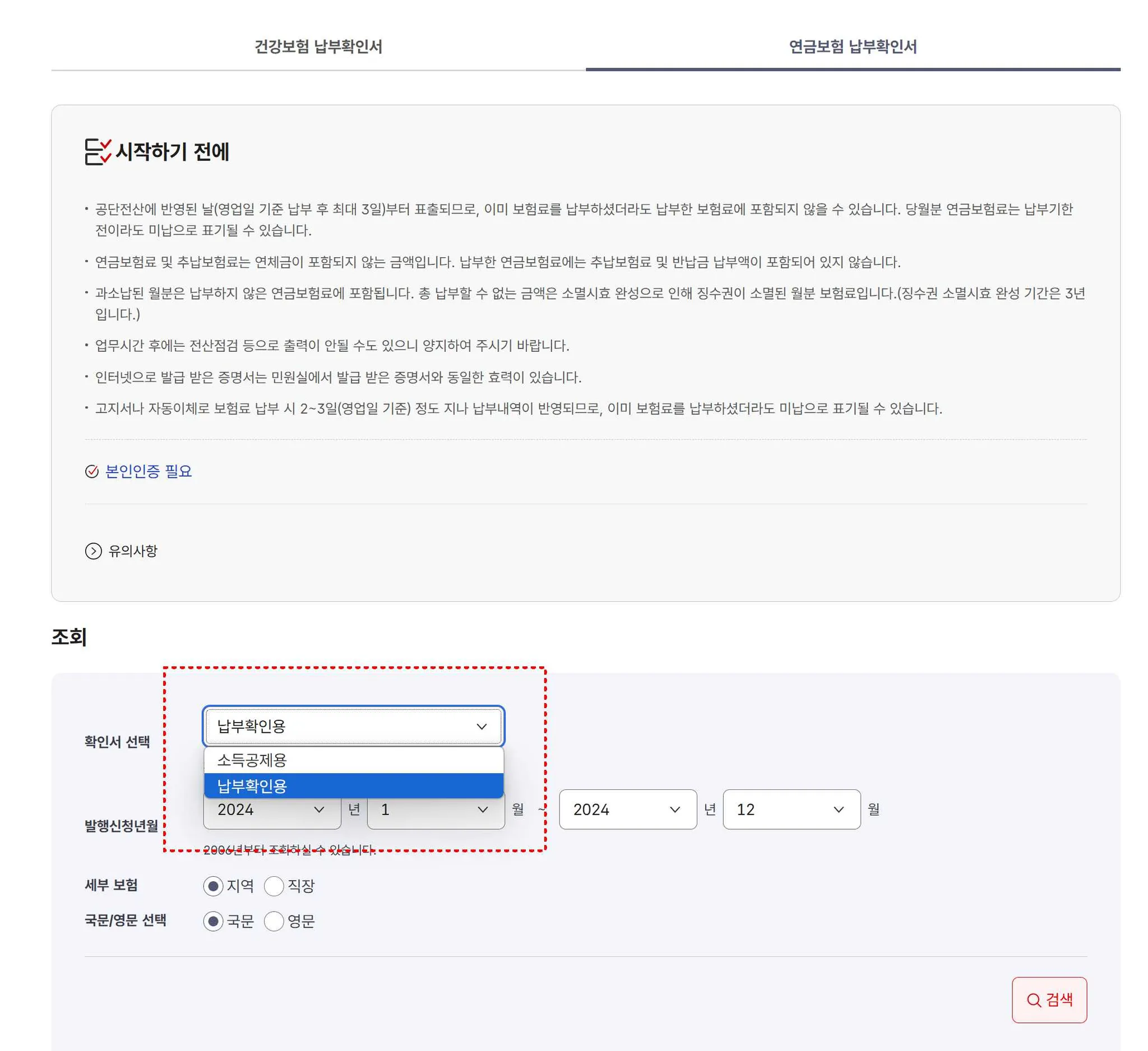 연금보험도 아래 동일하게 납부확인용 과세기간 설정후 조회 후 출력