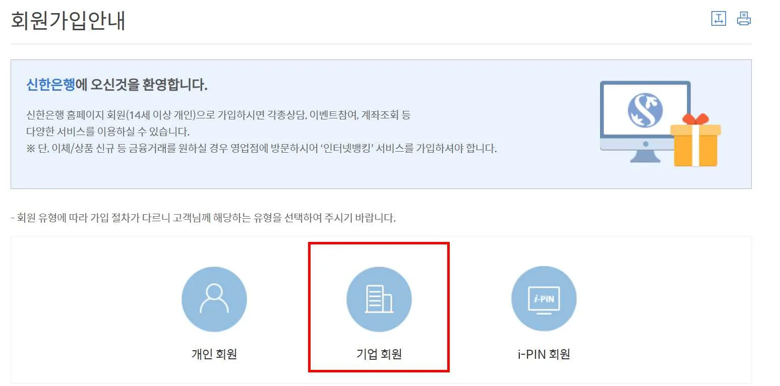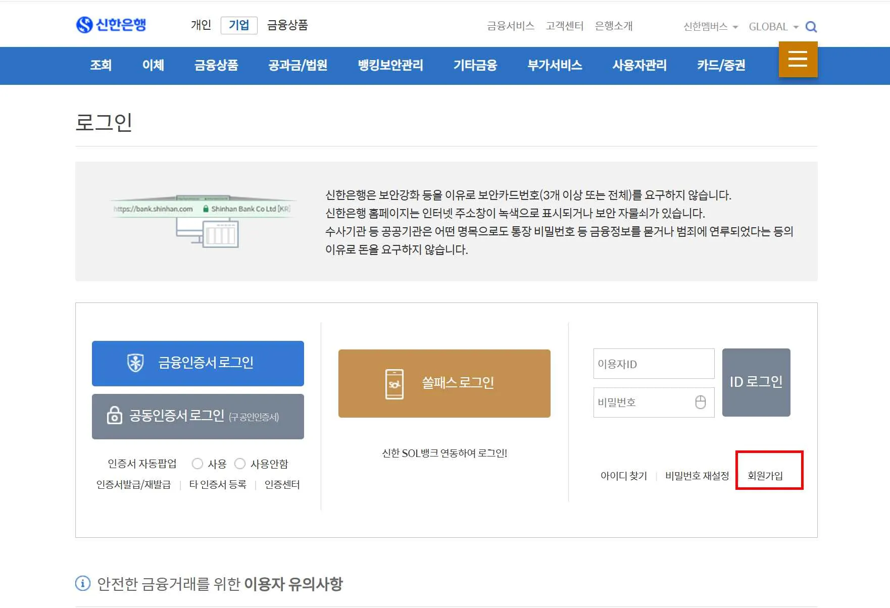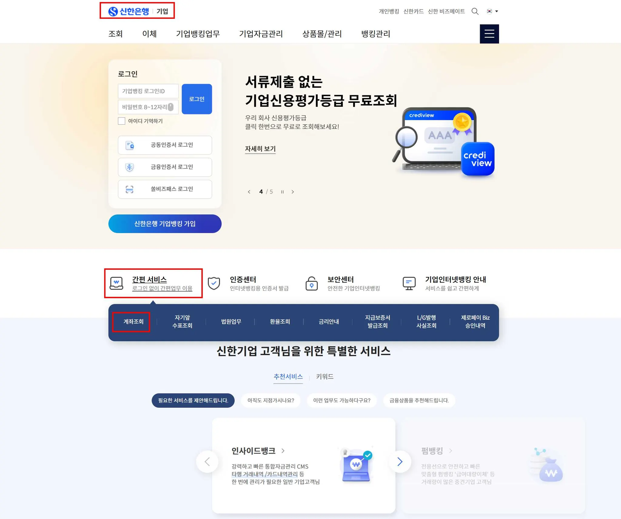 신한은행(기업뱅킹) 접속 (신한은행 간편조회는 기업인터넷뱅킹에 가입되어 있어야 합니다.)