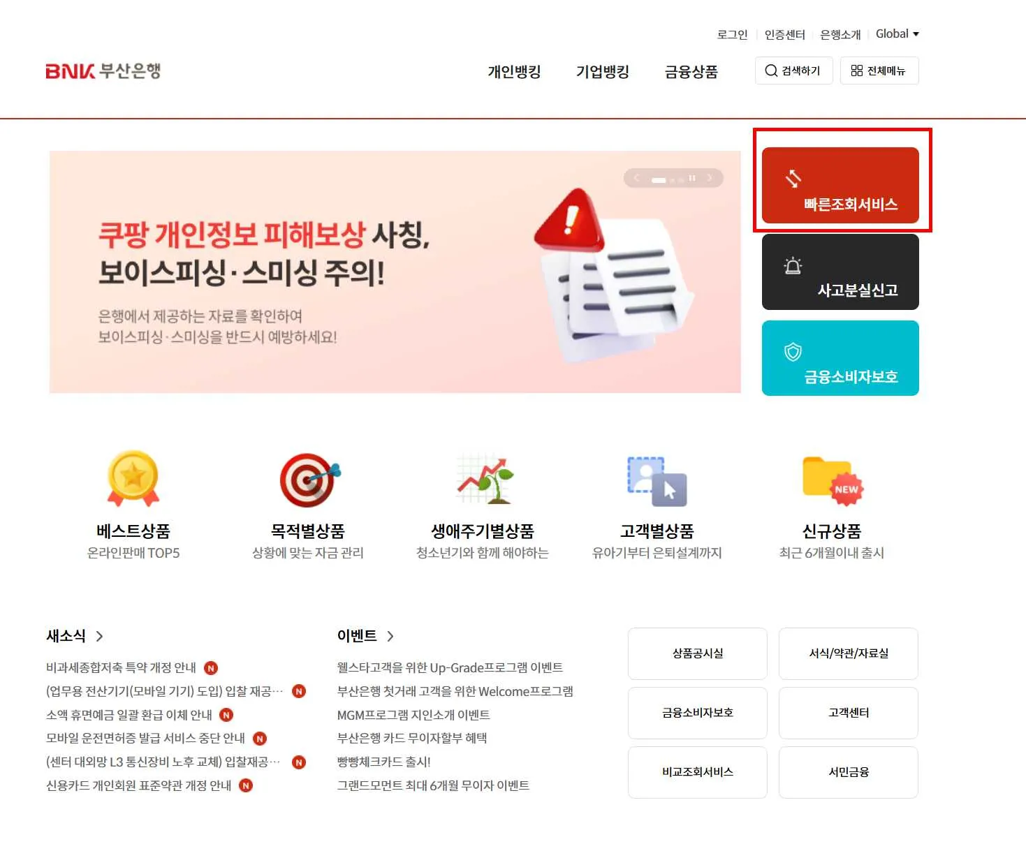 부산은행(기업뱅킹) 접속 (부산은행 빠른조회는 기업인터넷뱅킹에 가입되어 있어야 합니다.)