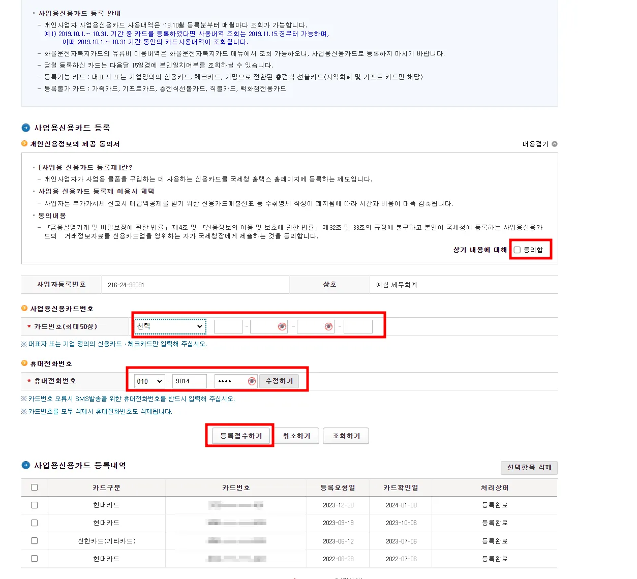 정보제공 동의 → 카드사 선택 → 카드번호 입력 → 휴대번호입력 → 등록접수하기